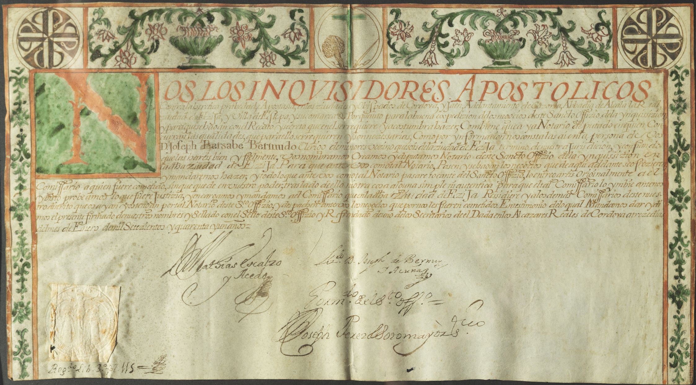 El cargo de familiar del Santo Oficio no llevaba aparejada remuneración económica alguna; en cambio, sí otorgaba a su poseedor un estatuto jurídico exclusivo, así como importantes privilegios, exenciones y preeminencias sociales. Por otro lado, la principal función de los secretarios del secreto del Santo Oficio era la de generar una gran parte de las tipologías documentales expedidas en un tribunal de distrito. Despachaban con los inquisidores en la audiencia principal y anotaban cuanto sucedía, relacionado con los procesos de fe. También correspondía a ellos la misión de bajar a la sala de tortura y levantar acta de los tormentos que se aplicaban a los acusados ante el tribunal. Así mismo, se encontraban presentes en los votos de sentencia y notificaban el resultado al reo, por duro que fuese. Por último, debían dejar constancia del cumplimiento de dicha sentencia2.