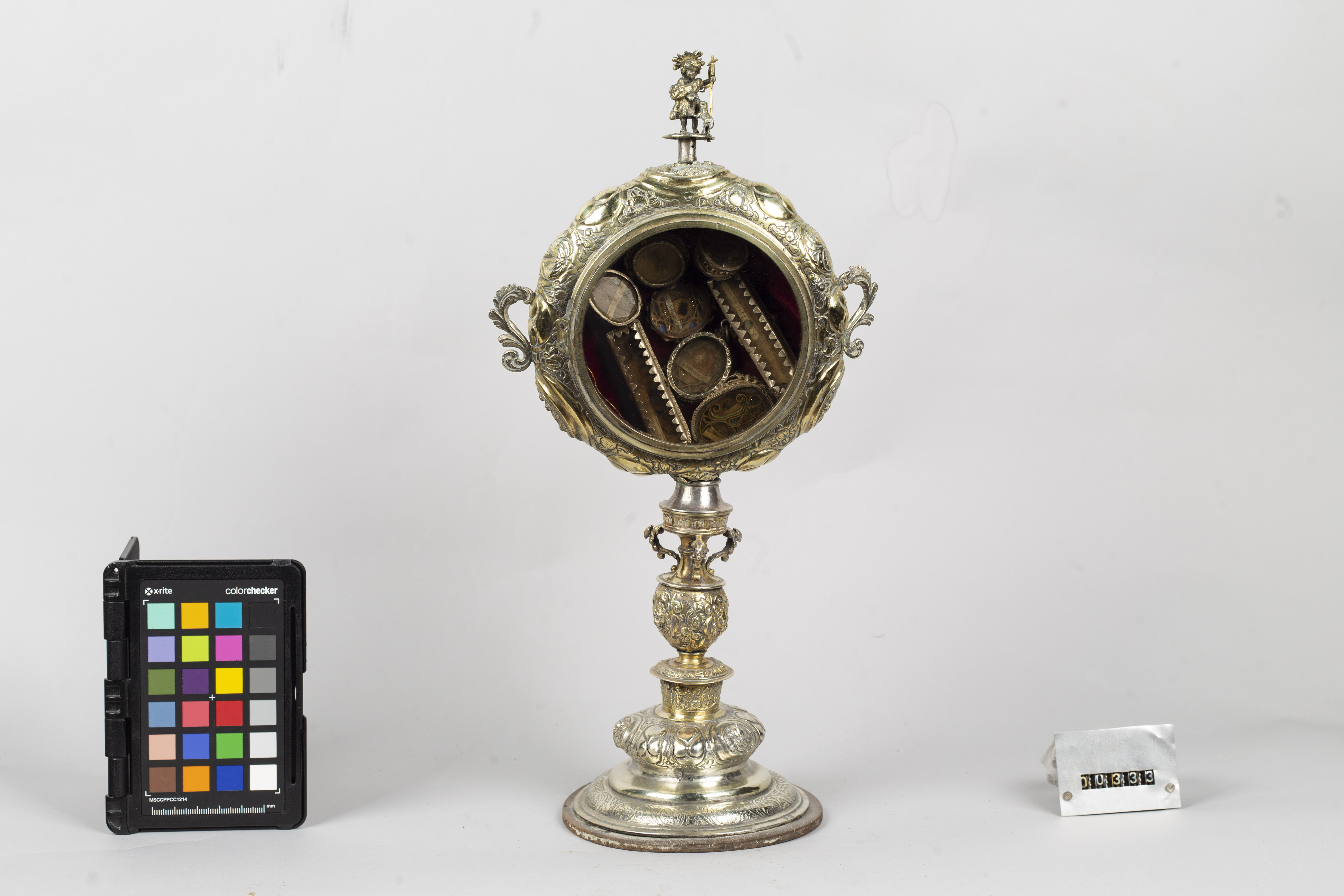 Este relicario realizado en la ciudad alemana de Nuremberg, alberga en su interior, entre otras, las reliquias del Lignun Crucis, San Juan Bautista y Santa Catalina. Este importante relicario fue regalado a la parroquia de San Juan Bautista en 1730 por el marqués de Alcántara del Cuervo, conservándose una auténtica de la reliquia de San Juan Bautista, fechada en Roma el día 15 de mayo de 1729. Tras la donación, el platero ecijano José Hernández Colmenares Gómez cobró 135 reales el día 8 de junio de 1732 por la ejecución de la figura del Bautista para el remate. Algunos días después, José Hernández cobró 50 reales por dos sepulcros de plata que hizo para insertarle las reliquias de "... un pedazo de la camisa de San Fernando, una espina de la corona de Cristo, la sangre de San Mateo y un hueso de San Andrés...".