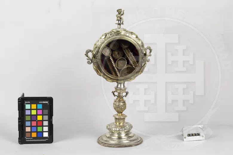Este relicario realizado en la ciudad alemana de Nuremberg, alberga en su interior, entre otras, las reliquias del Lignun Crucis, San Juan Bautista y Santa Catalina. Este importante relicario fue regalado a la parroquia de San Juan Bautista en 1730 por el marqués de Alcántara del Cuervo, conservándose una auténtica de la reliquia de San Juan Bautista, fechada en Roma el día 15 de mayo de 1729. Tras la donación, el platero ecijano José Hernández Colmenares Gómez cobró 135 reales el día 8 de junio de 1732 por la ejecución de la figura del Bautista para el remate. Algunos días después, José Hernández cobró 50 reales por dos sepulcros de plata que hizo para insertarle las reliquias de "... un pedazo de la camisa de San Fernando, una espina de la corona de Cristo, la sangre de San Mateo y un hueso de San Andrés...".